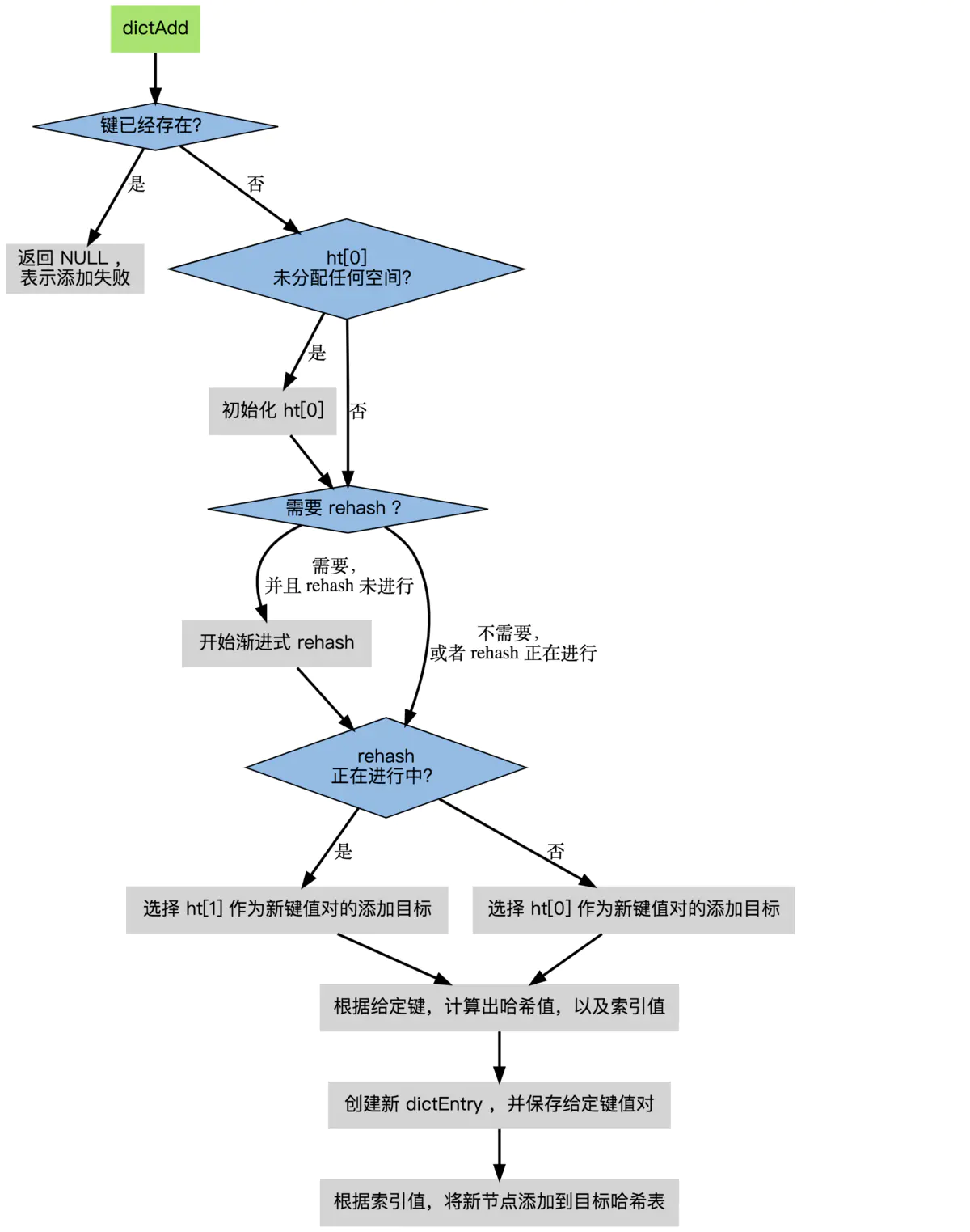 dictAdd 添加键值对到dict,检查到需要进行rehash时,会将dict.rehashidx 设置为 0 ,标识着 rehash 的开始;