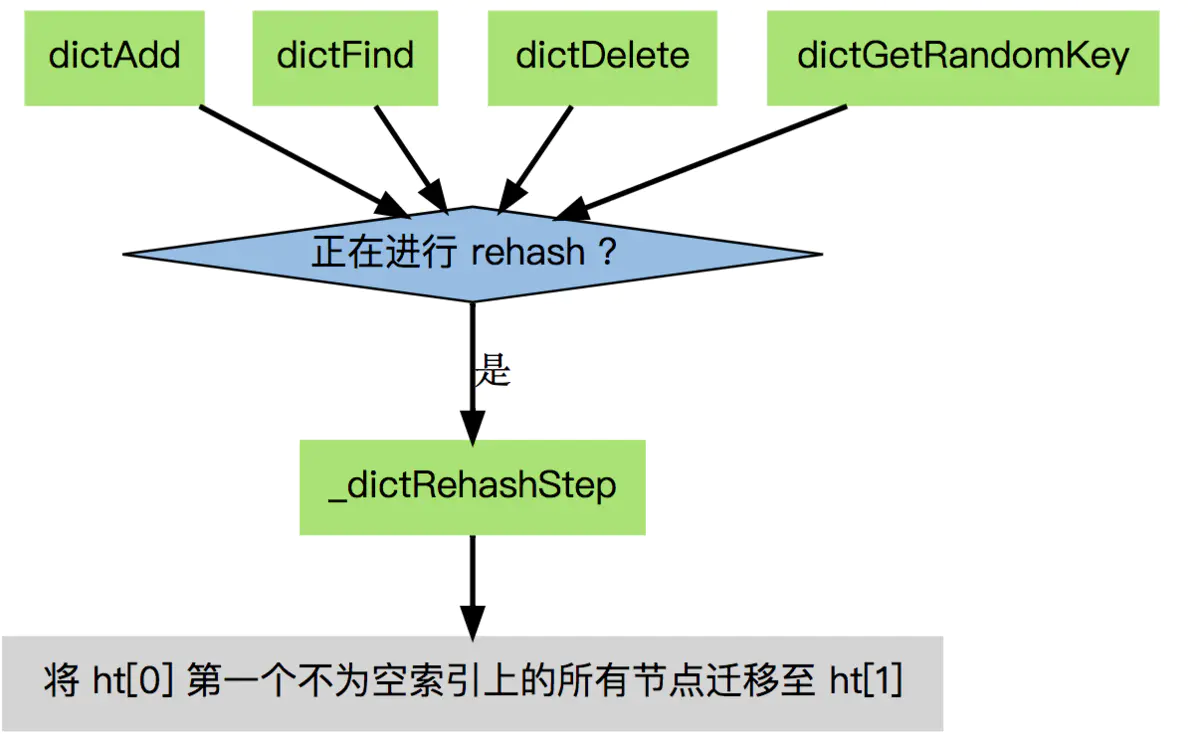 也就是在某次dictAdd 添加键值对时,触发了rehash;后续add、delete、find命令在执行前都会检查,如果dict正在rehash,就先不急去执行自己的命令,先去帮忙搬运一个bucket;