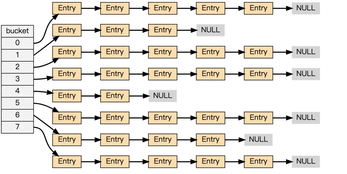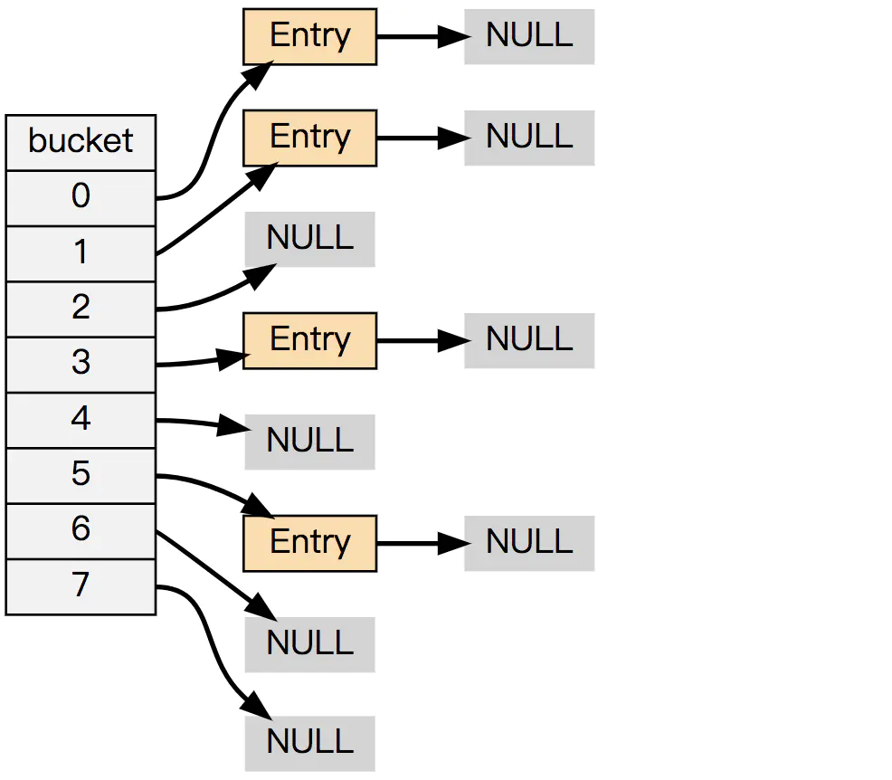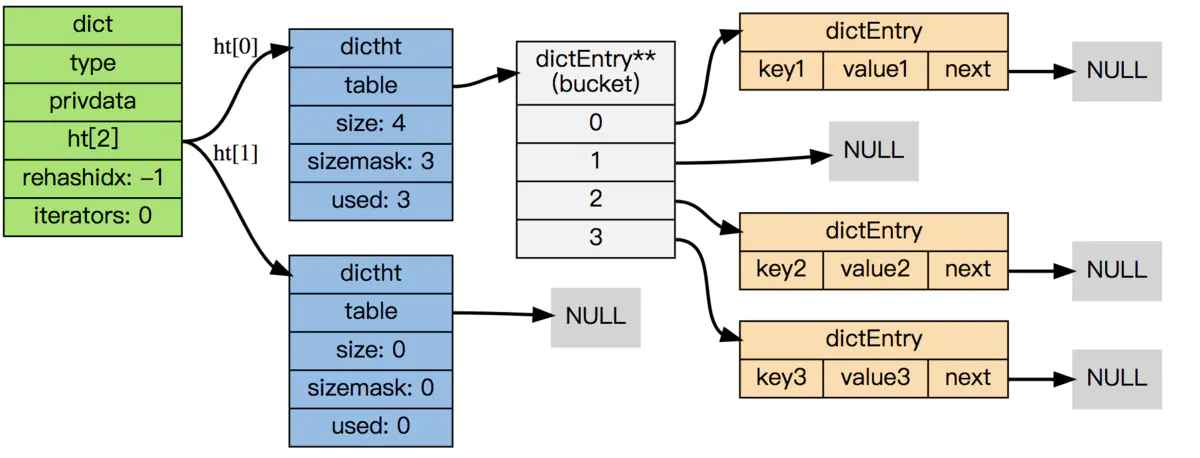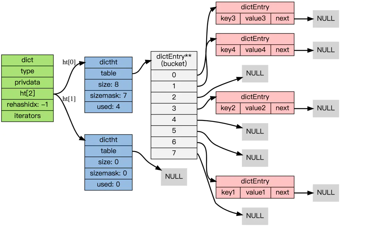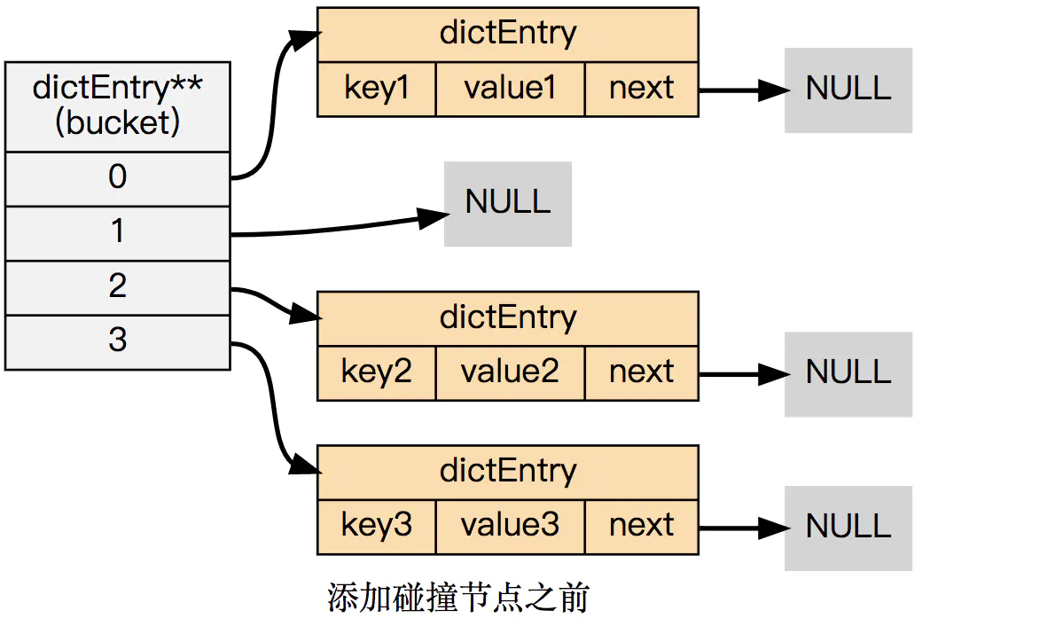 - 一个dictEntry指针数组(table)。key的哈希值最终映射到这个数组的某个位置上(对应一个bucket)。如果多个key映射到同一个位置,就发生了冲突,那么就拉出一个dictEntry链表。