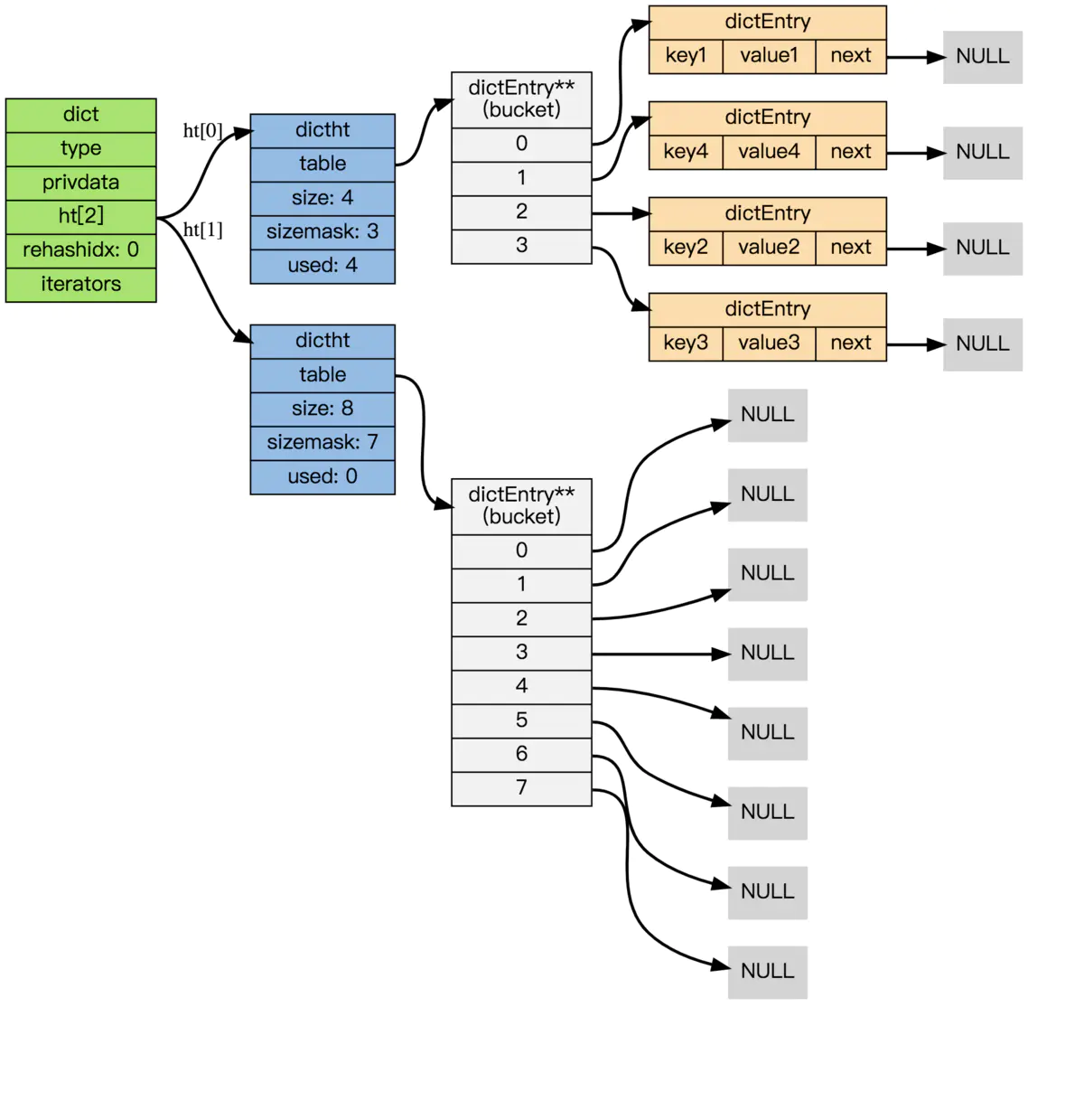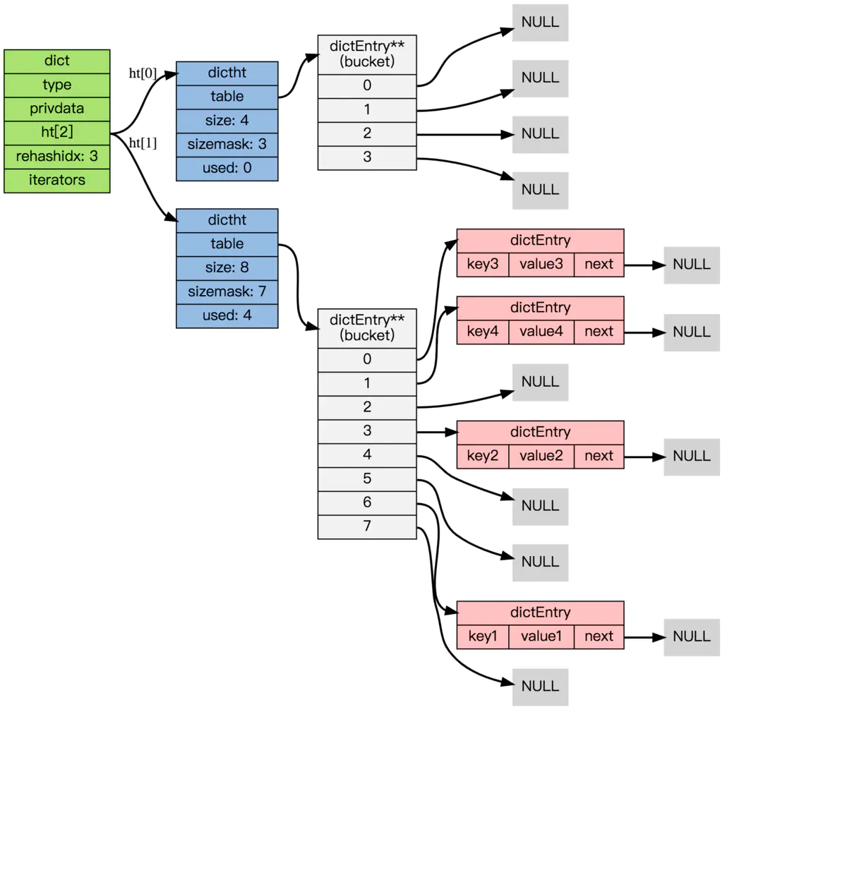 到了这个阶段,所有的节点都已经从 ht[0] 迁移到 ht[1] 了: