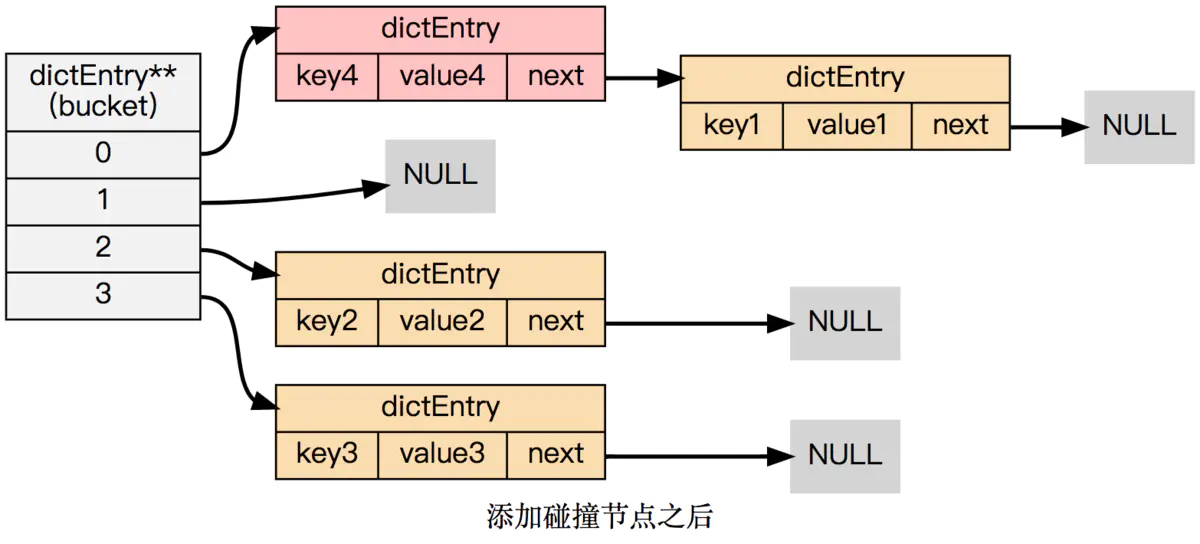 字典哈希表所使用的碰撞解决方法被称之为链地址法: 这种方法使用链表将多个哈希值相同的节点串连在一起, 从而解决冲突问题。