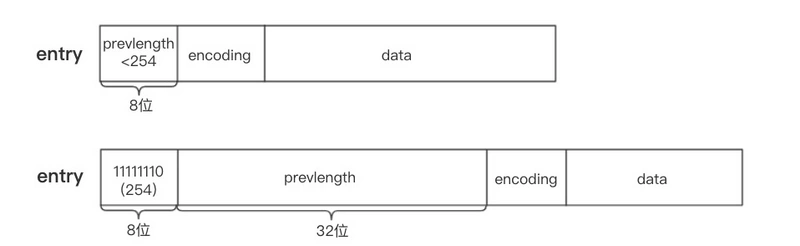 - entry的前8位等于254,则意味着上一个节点的长度无法用8位表示,后面32位才是真实的prevlength。用254 不用255(11111111)作为分界是因为255是zlend的值,它用于判断ziplist是否到达尾部。