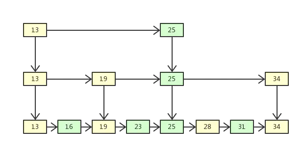 <16,23,25,31>这几个数字的话,简单的方法就是遍历一遍,时间复杂度为O(N)。数据量小的话还好,但是数据量一旦十分庞大的话就非常耗时了。这个时候就是需要我们去优化的了,找一个线性的顺序表,我们一般使用二分法查找,时间复杂度为O(LogN)。但是链表不适用二分法去查找(链表没有线性表那种连续下标,无法确定中间位置)。于是跳表产生了,它是一种随机化的数据结构,类似二叉搜索树,我们把一些节点提取出来作为索引。如下:>这几个数字的话,简单的方法就是遍历一遍,时间复杂度为O(N)。数据量小的话还好,但是数据量一旦十分庞大的话就非常耗时了。这个时候就是需要我们去优化的了,找一个线性的顺序表,我们一般使用二分法查找,时间复杂度为O(LogN)。但是链表不适用二分法去查找(链表没有线性表那种连续下标,无法确定中间位置)。于是跳表产生了,它是一种随机化的数据结构,类似二叉搜索树,我们把一些节点提取出来作为索引。如下: