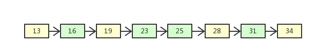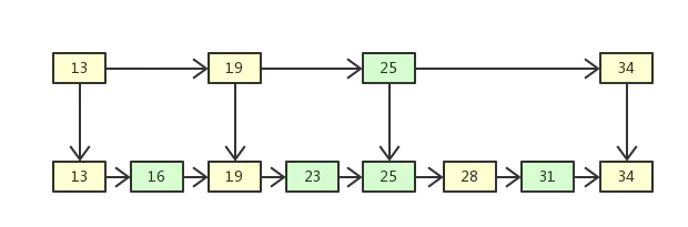 如上图所示,有一个链表保存着若干有序的数字,如果我们想找到