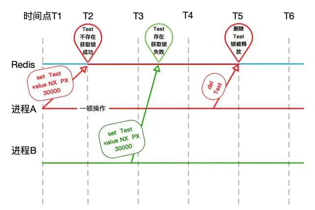 setnx大致原理,主要依托了它的key不存在才能set成功的特性,进程A拿到锁,在没有删除锁的Key时,进程B自然获取锁就失败了。