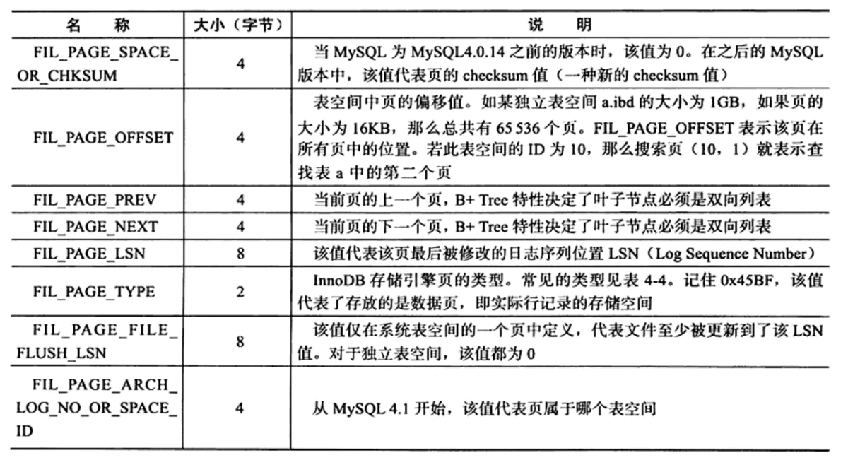 File Header用来记录页的一些头信息,共由如下8部分组成,共占用38字节: