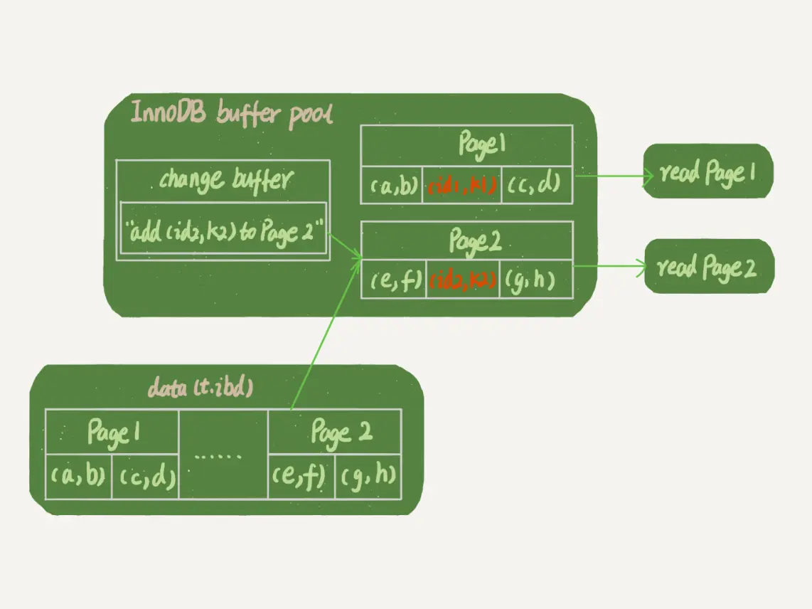 - Page 2 没有在内存中,就在内存的 change buffer 区域,记录下“我要往 Page 2 插入一行”这个信息