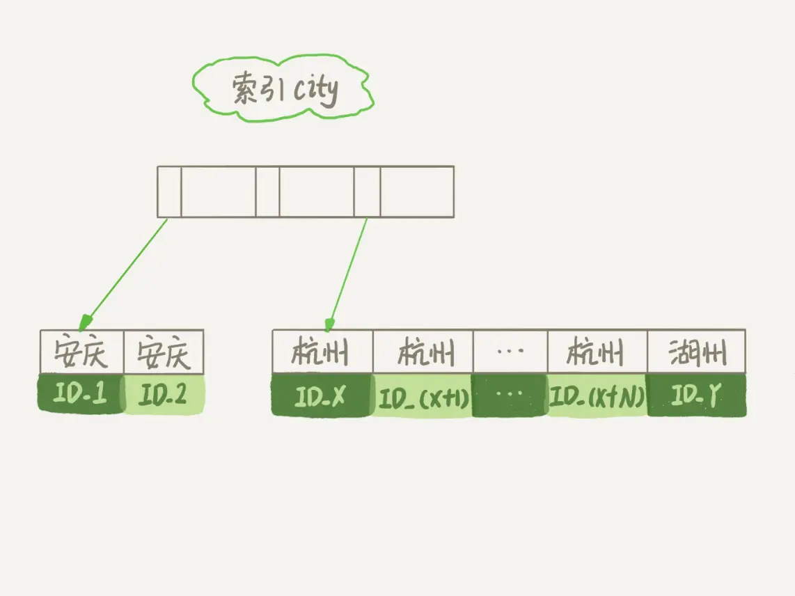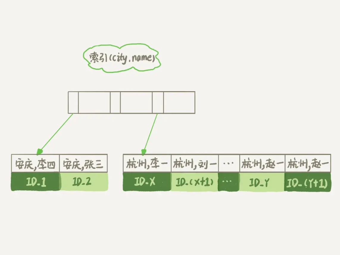 从图中可以看到,满足 city='杭州’条件的行,是从 ID_XID_(X+N) 的这些记录。