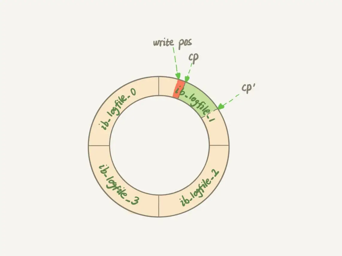 checkpoint 可不是随便往前修改一下位置就可以的。把 checkpoint 位置从 CP 推进到 CP’,就需要将两个点之间的日志(浅绿色部分),对应的所有脏页都 flush 到磁盘上。之后,图中从 write pos 到 CP’之间就是可以再写入的 redo log 的区域。