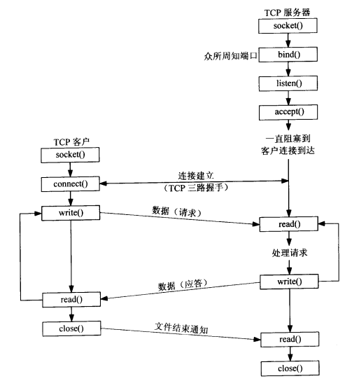 • connect()函数:客户端与服务端建立连接,函数原型为:int connect(int sockfd, const struct sockaddr *servaddr, socklen_t addrlen);,第一个参数是客户端的socket描述符,第二个参数是一个指向socket地址结构(含有服务端的IP地址以及端口号)的指针,第三个参数为该结构的大小。调用connect函数会激发TCP三次握手过程,而且仅在连接成功或出错时才返回。
