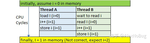 对于i++这样的操作,其实是分3步执行的,读取i的值,增加i的值,回写i的新值。这3步每一步都是原子操作,但是组合在一起就不一定是原子操作了。可以参看下图中两个线程对i的争抢示例。我们期待线程A与B中的i++可以顺序执行,最终存储器中的结果是2;但是实际上由于两个线程并行执行,结果可能得到1(当然也有可能得到2,运气好的话)。通常i++这样的操作我们称为“读-改-写”操作。